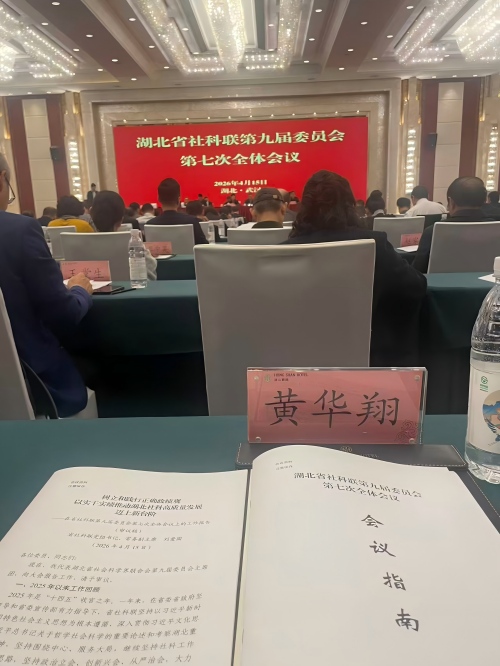 2026年4月15日上午,湖北省社科联第九届委员会第七次全体会议在武汉洪山宾馆召开,湖北省纺织产业发展研究会外联部部长黄华翔总经理出席湖北省社科联第九届委员会第七次全体会议。会议全面回顾总结了省社科联2025年以来的工作,并研究部署下一阶段工作。省社科联第九届委员会主席赵凌云主持会议,省社科联党组书记、常务副主席刘爱国代表省社科联第九届委员会主席团向大会作工作报告。省社科联党组成员、副主席刘卫桥就有关人事议题作说明。省政府副秘书长何丽君、省委宣传部副部长赵理富出席会议。会议表决通过了有关人事议题,审议通过了省社科联九届七次全会工作报告。
